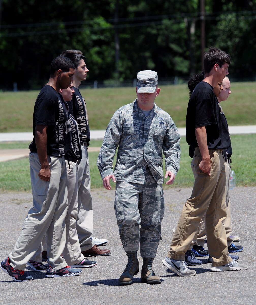 2nd Lt. Christopher Sullivan, 2nd Bomb Wing Public Affairs officer, looks at the feet of recruits to ensure they are properly positioned during a drill procedure on Barksdale Air Force Base, La., June 7, 2014. Sullivan, a former Military Training Instructor, has pushed thousands of trainees through Air Force Basic Military Training. (U.S. Air Force photo/Senior Airman Benjamin Gonsier)