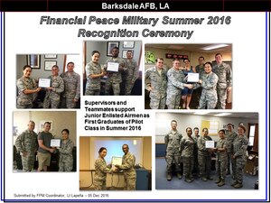 June 23, 2017 Making a difference in Barksdale through financial peace Financial Peace Military (FPM) is celebrating its first anniversary in Barksdale as it continues to bring hope to our Airmen and their families! Within the past year, over sixty Barksdale Airmen have attended FPM, and the military team of volunteers who have the heart to make a difference in