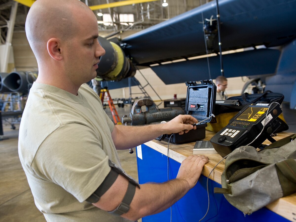 Senior Airman Paul Nessle, 2nd Maintenance Squadron non-destructive inspector, checks for cracks on an aircraft part during a fluorescent magnetic particle test on Barksdale Air Force Base, La., May 9. When applied to a magnetized part, the solution accumulates in small cracks, making them visible under a black light. (U.S. Air Force photo/Staff Sgt. Chad Warren)(RELEASED)
