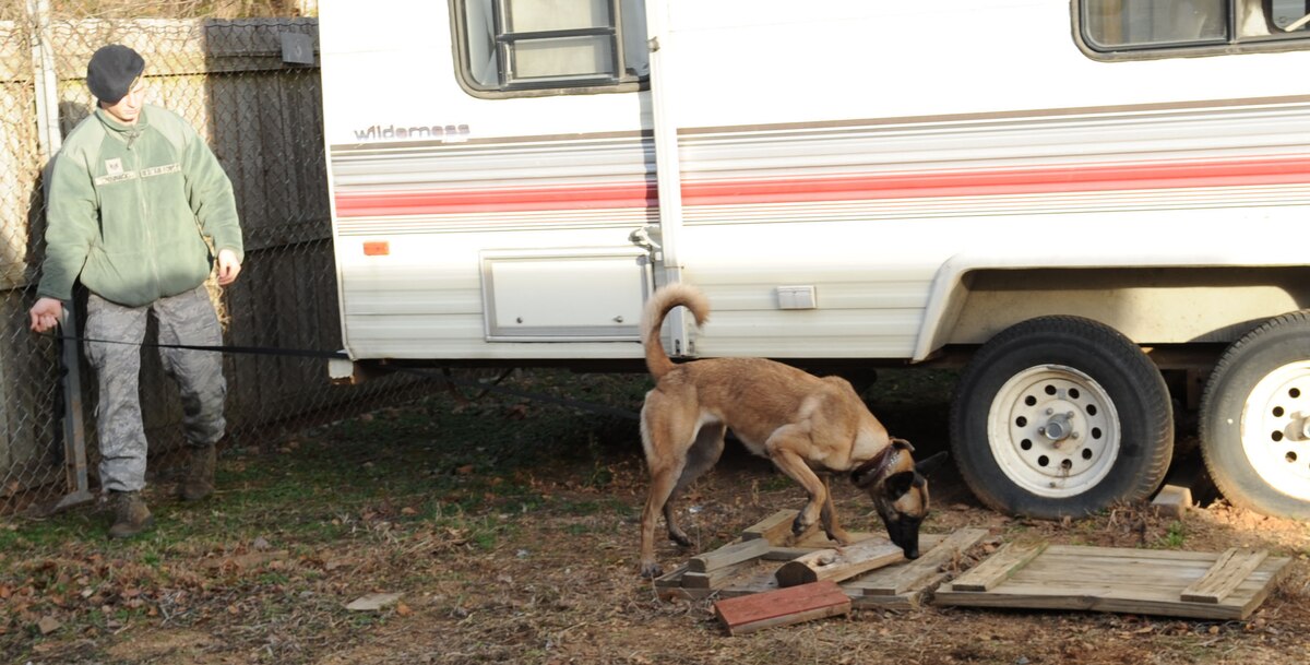 Staff Sgt. Mark Chojnacki, 2nd Security Forces Squadron military working dog handler, leads his dog Mila, MWD, on a search on Barksdale Air Force Base, La., Jan. 7. MWDs are trained in many things such as street patrol, maintaining and guarding entry control points, and detection of narcotics and ordnance. Sweeps of buildings, vehicles, warehouses, open fields or areas are conducted as well. (U.S. Air Force photo/Airman 1st Class Sean Martin)(Released)