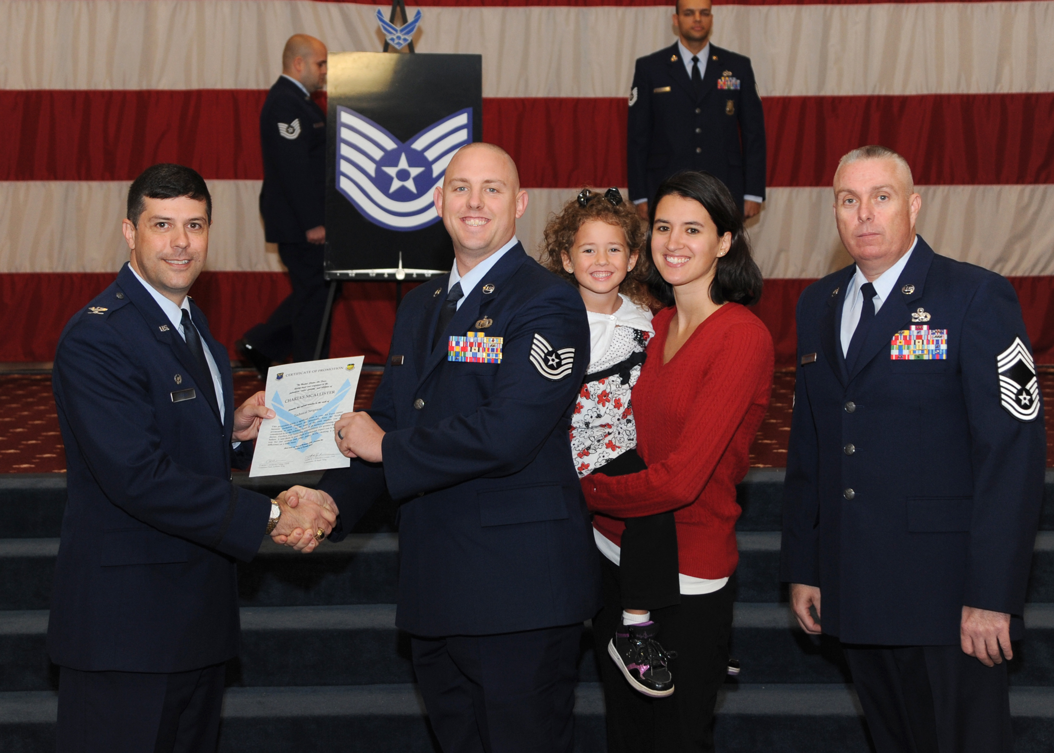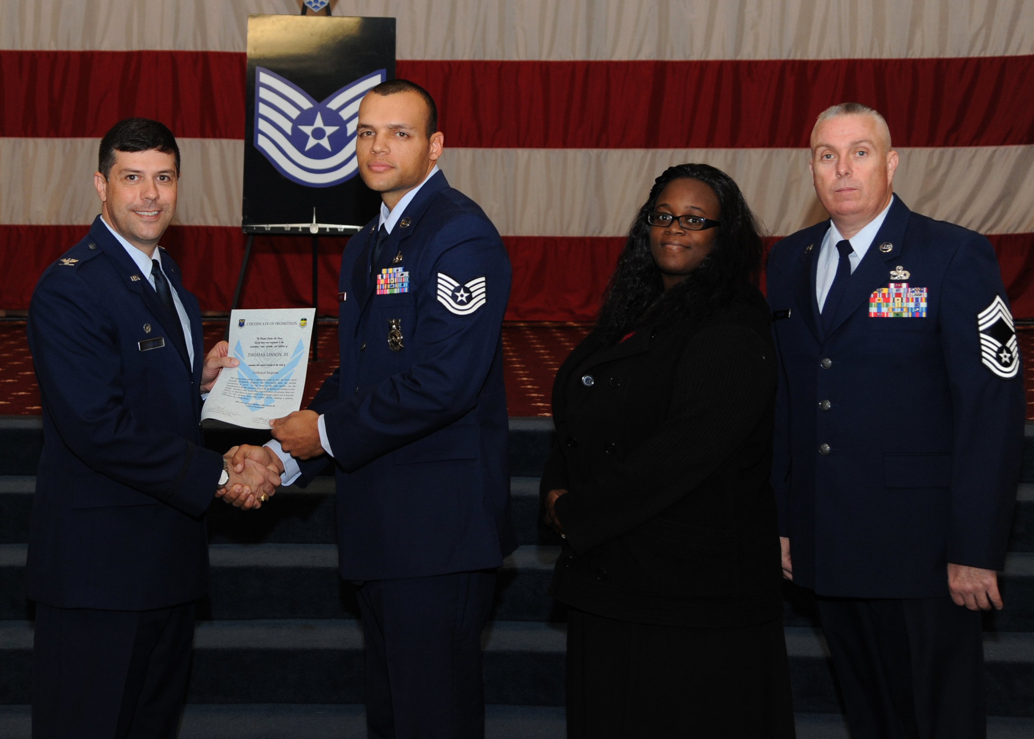 Master Sgt. Roberto Torres Jr., 2nd Logistics Readiness Squadron, receives a certificate of promotion from Col. Andrew Gebara, 2nd Bomb Wing commander, and Chief Master Sgt. Beau Markin, 2nd Maintenance Group, during the November Wing Promotion Ceremony on Barksdale Air Force Base, La., Nov. 27, 2013. (U.S. Air Force photo/Senior Airman Joseph A. Pagán Jr.)