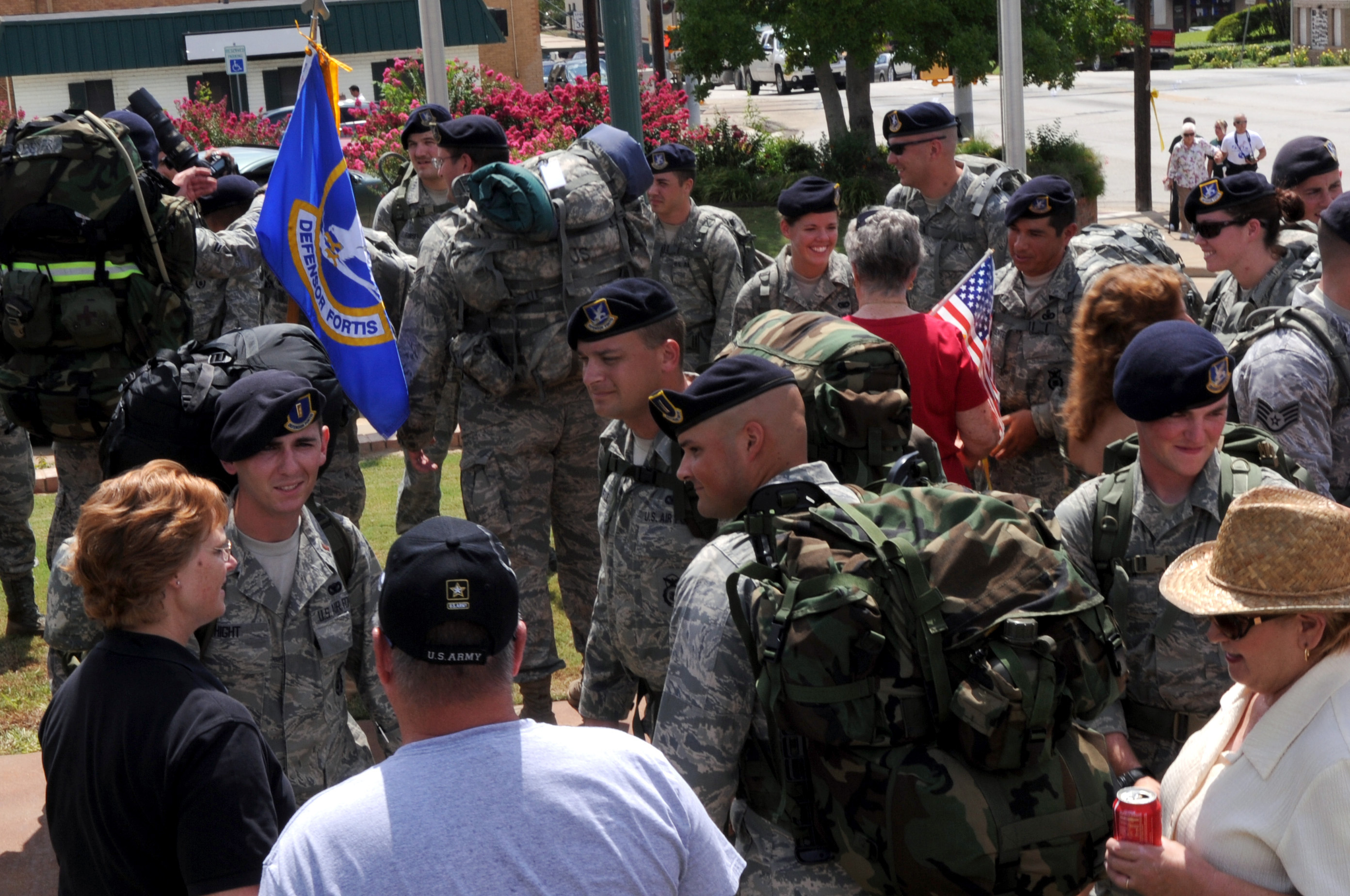 Members of the Livingston, Texas, community talk with security forces members from Barksdale Air Force Base, La., and Kessler Air Force Base, Miss., after passing the security forces guidon, July 20. More than 50 supporters came out to cheer for the members. (U.S. Air Force photo/Senior Airman La'Shanette V. Garrett) (RELEASED)