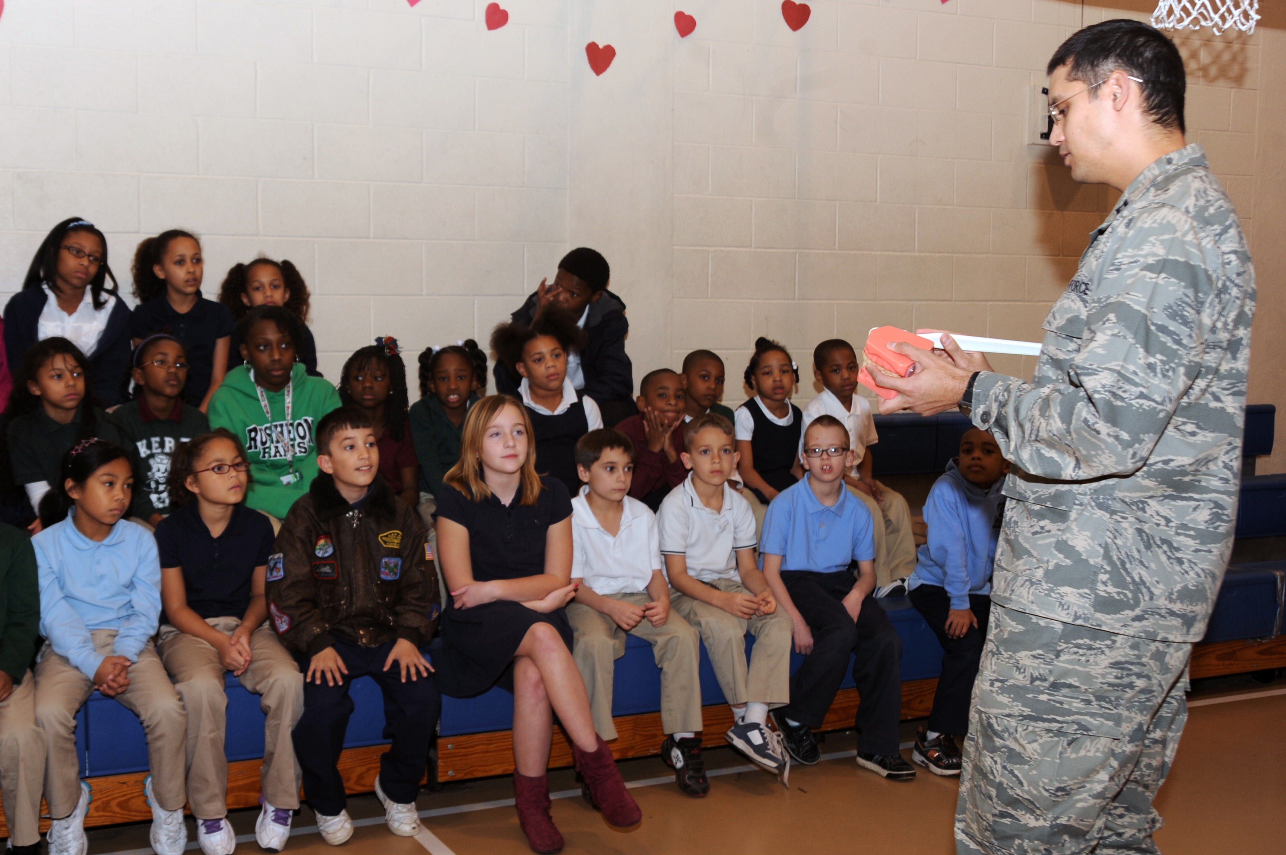 Capt. Donnie Pritchett, 2nd Dental Squadron dentist, demonstrates how to correctly brush teeth at the Barksdale Youth Center on Feb. 15. February is Children's Dental Health Month. (U.S. Air Force photo/Senior Airman Brittany Y. Bateman)(RELEASED)