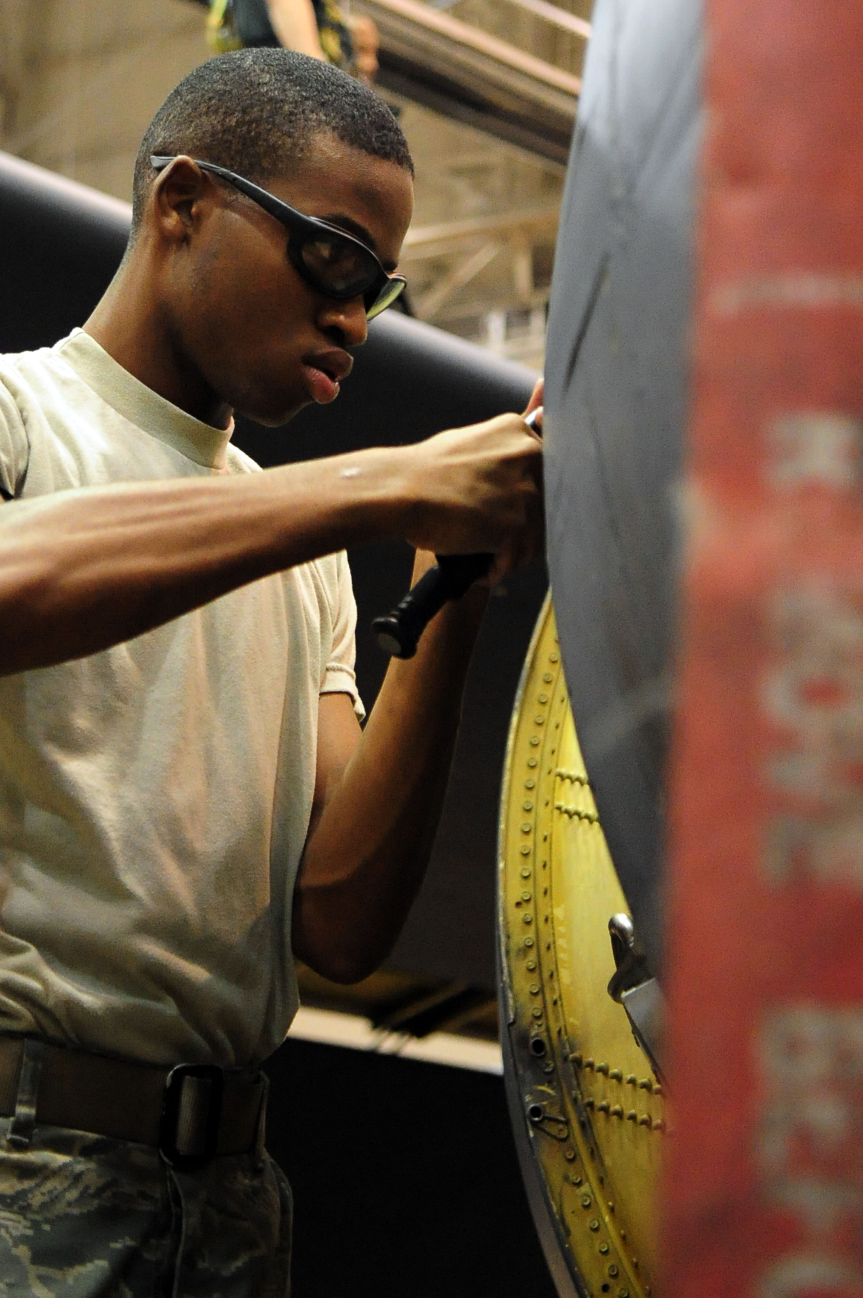 BARKSDALE AIR FORCE BASE, La. - Airman 1st Class Jeremy Mayfield, 2d Maintenance Squadron, performs routine maintenance on a B-52H Stratofortress during a phase inspection Nov. 24. Phase inspections are a 14-day process that are key to aircraft up keep, including routine maintenance such as oil and lube services. (U.S. Air Force photo by Senior Airman Joanna M. Kresge)
