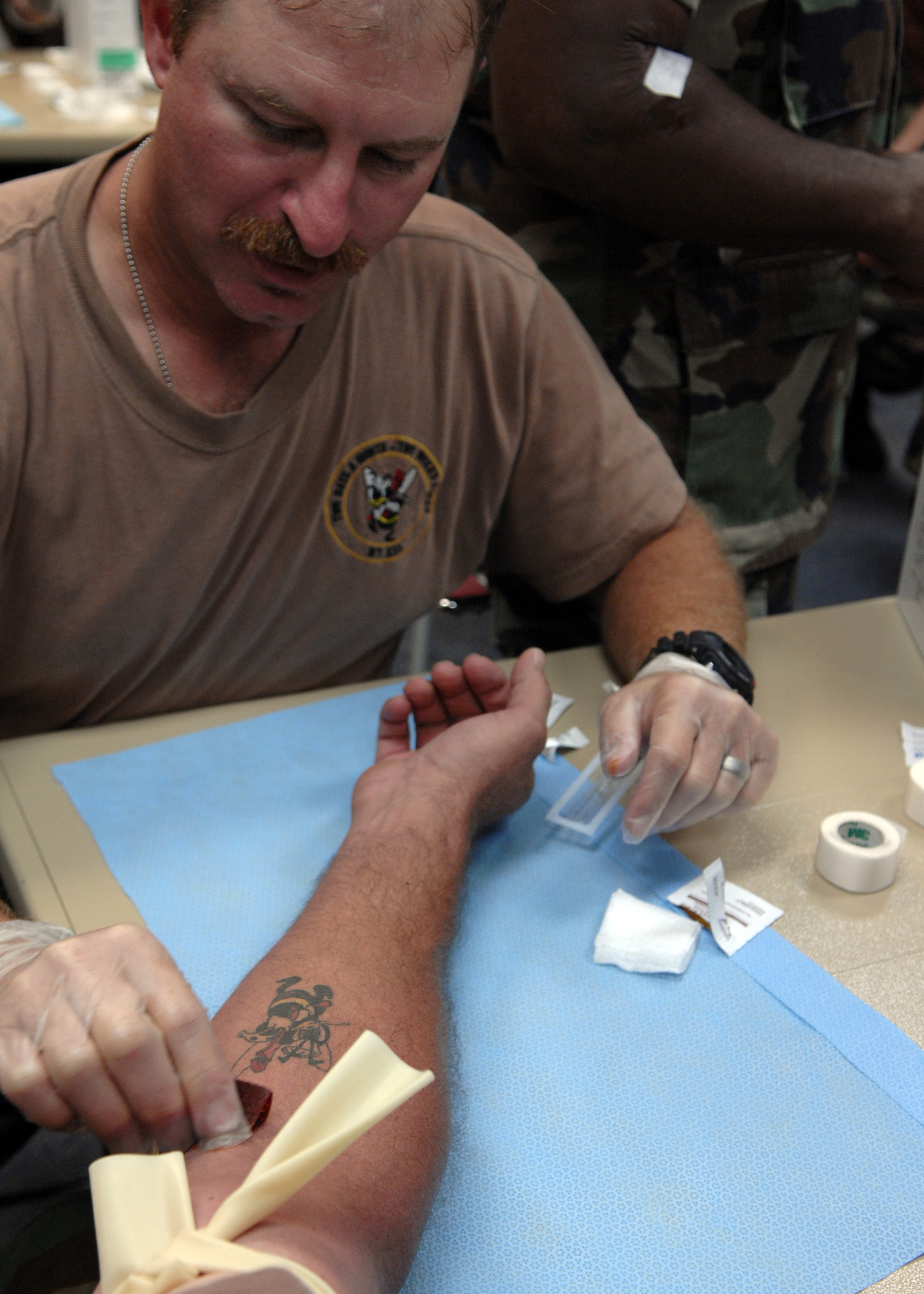 BARKSDALE AIR FORCE BASE, La. - A member of the Navy Mobile Construction Battalion 28 put the Combat Lifesaver skills they just learned to use June 20. The Seabees as they are more commonly called are participating in a four day long exercise to prepare the unit for deployment. (U.S. Air Force photo by Airman 1st Class Joanna M. Kresge)