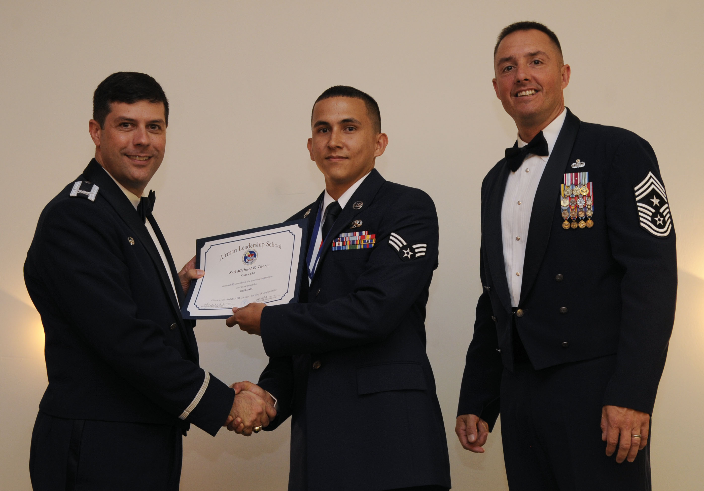 Senior Airman Michael Thorn, 2nd Aircraft Maintenance Squadron, receives an Airman Leadership School graduation certificate from Col. Andrew Gebara, 2nd Bomb Wing commander, on Barksdale Air Force Base, La., Aug. 15, 2013. (U.S. Air Force photo)